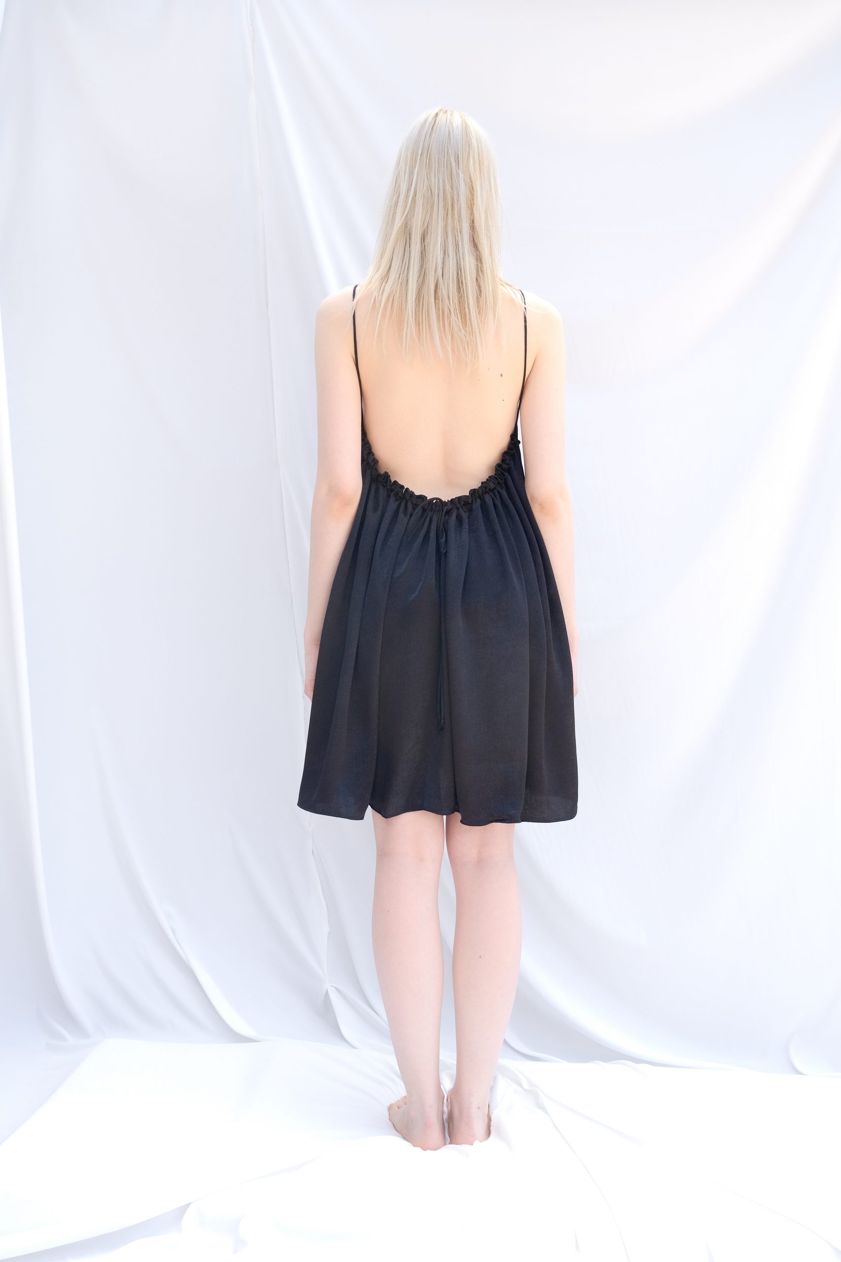 • Key Details: Delicate spaghetti straps, gathered back with tie detail, mini length, and a flowing A-line silhouette.